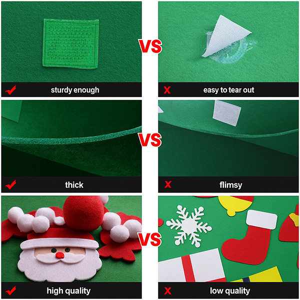 Hechos del mismo fieltro grueso y de alta calidad. Se sujetan con velcro cosido (a diferencia de los más baratos pegados). Ejemplos incluyen campanas, regalos, muñeco de nieve, caramelos y copos de nieve. El árbol tiene una estrella para la parte superior y un tronco para la base. El velcro está cosido en el árbol para sujetar ambas piezas de forma segura.