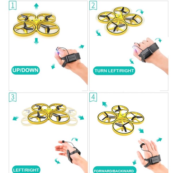 1. Ascenso y descenso: presione el botón en su dedo. El dron ajustará su altura de acuerdo con el cambio en la altura del brazo.