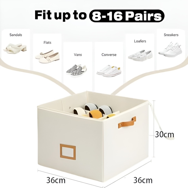 El organizador de zapatos SHOVERA está diseñado para guardar de 8 a 16 pares de zapatos, incluidos sandalias, pantuflas y zapatillas, en un tamaño compacto de 36x36x30 cm. Su diseño plegable permite guardarlo fácilmente cuando no se utiliza, lo que lo hace ideal para hogares, dormitorios y calzado de temporada.