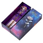 Cada rosa está elaborada con un recubrimiento iridiscente y holográfico que brilla hermosamente a la luz, creando un destello galáctico simplemente hipnotizante.