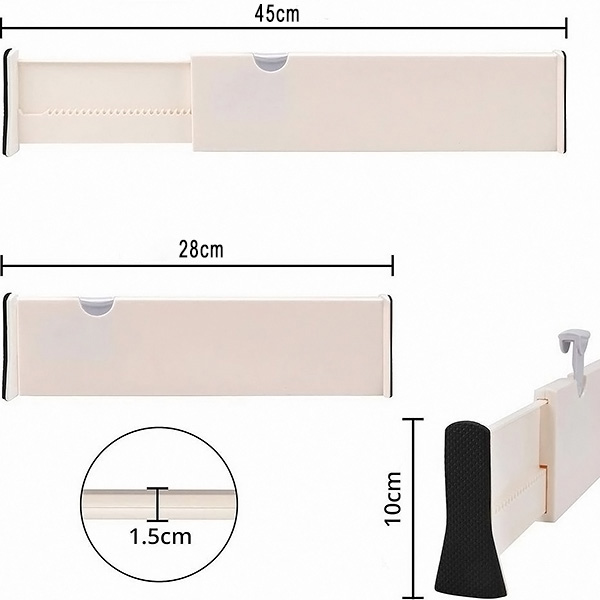 Ya sean utensilios de cocina, artículos de baño o calcetines en el dormitorio, estos separadores se ajustan de 28 cm a 45 cm para adaptarse a la mayoría de los cajones. Puedes personalizar tu espacio exactamente como lo necesites.