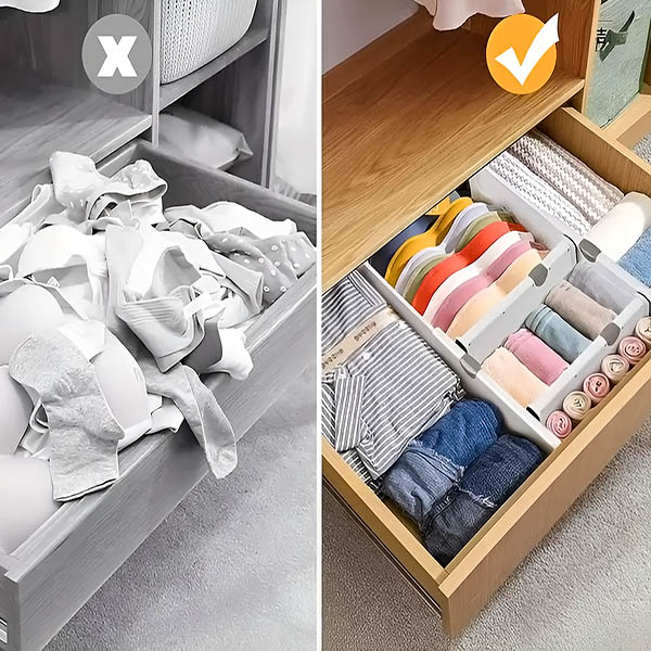 No solo para cajones: estos separadores también funcionan perfectamente en estantes. Úsalos para organizar libros, cosméticos o material de oficina en estanterías abiertas, manteniendo todo en su lugar asignado.